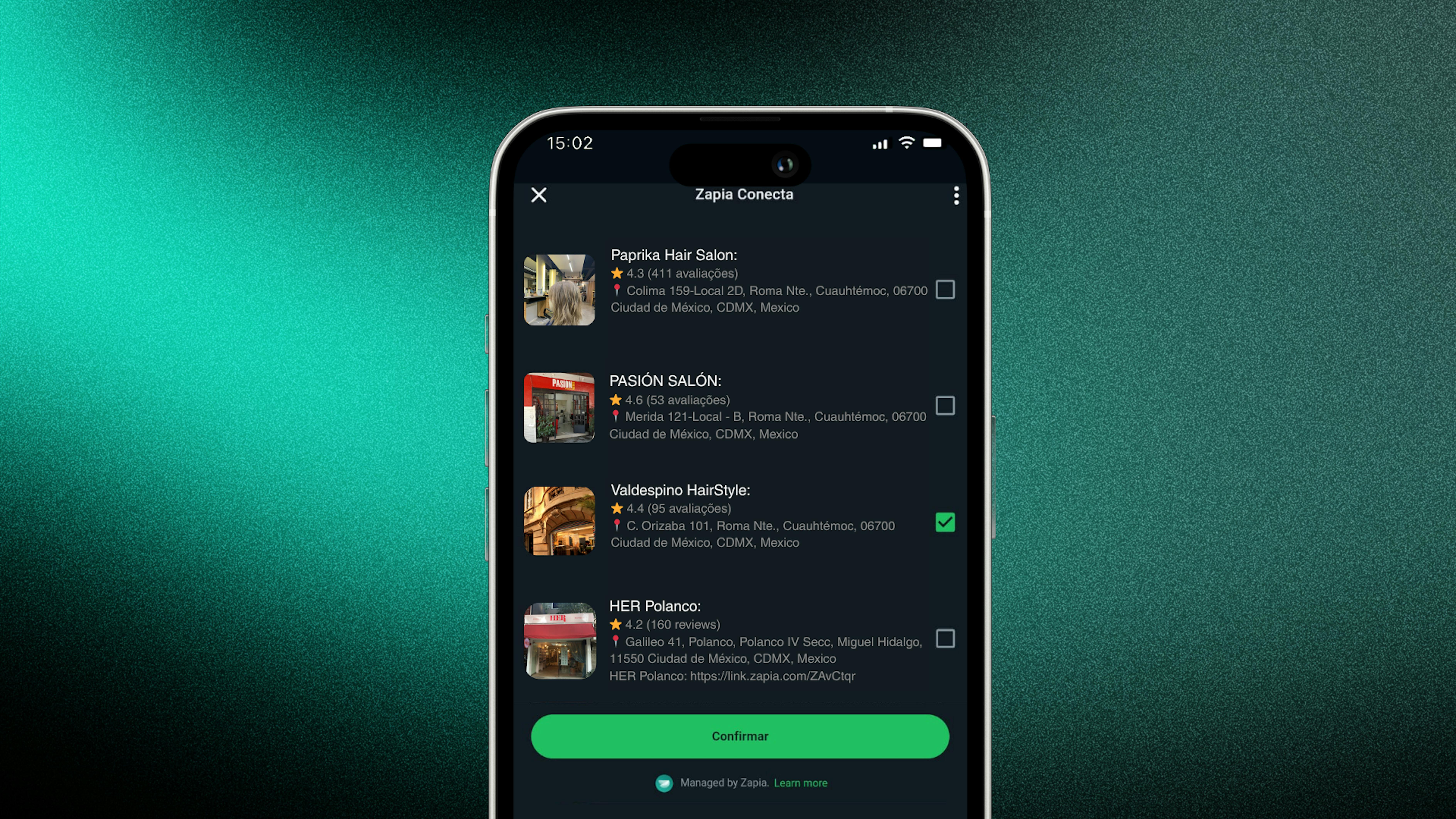 Zapia Conecta conversa con los establecimientos y trae actualizaciones sobre la tarea. Confirma la elección o decisión del usuario y finaliza la reserva o tarea con los establecimientos contactados.